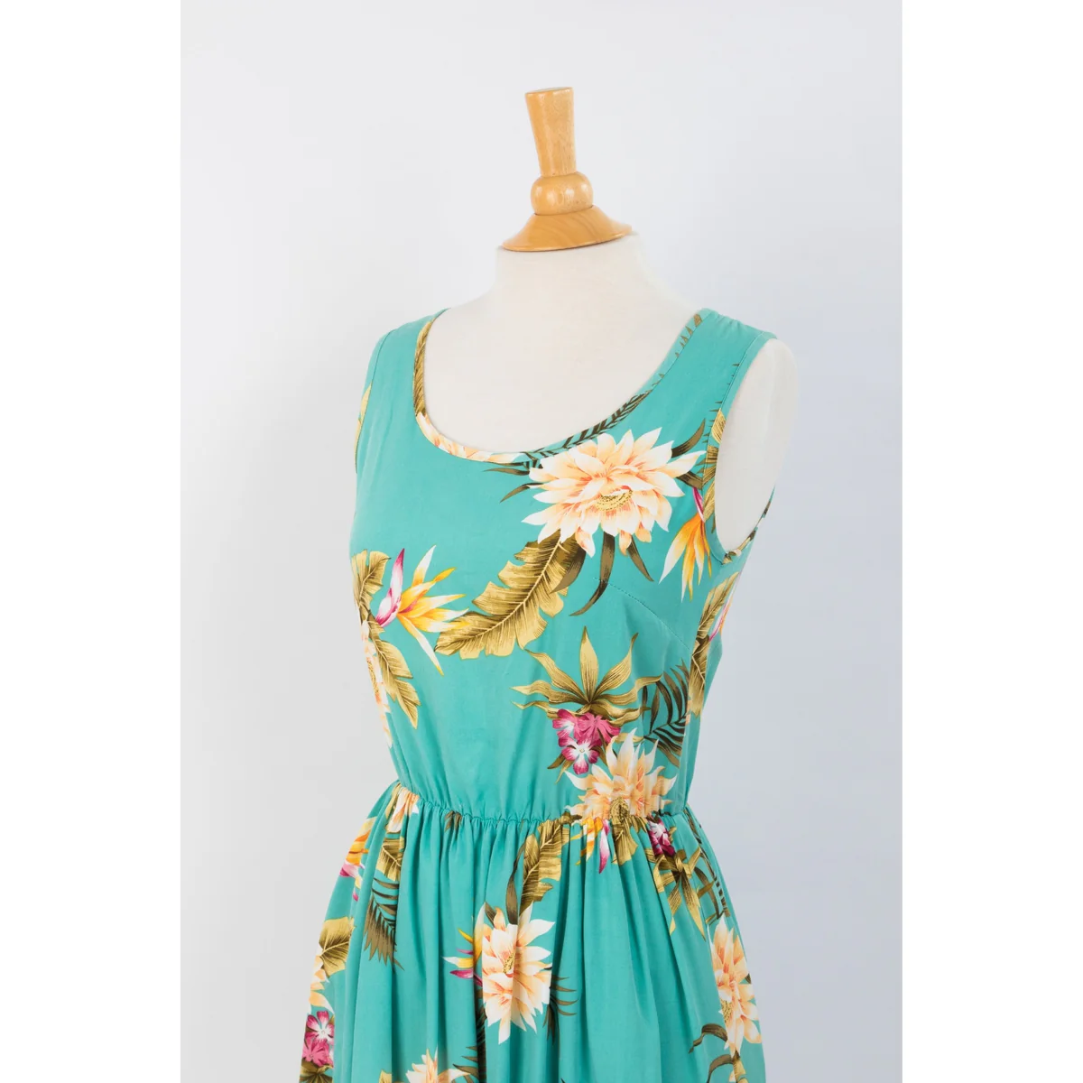 The beautiful light teal green rayon fabric with ceres flower print is very popular in Hawaii. The perfect color for beach settings. It is not too dark, and match with Hawaiian ocean colors.