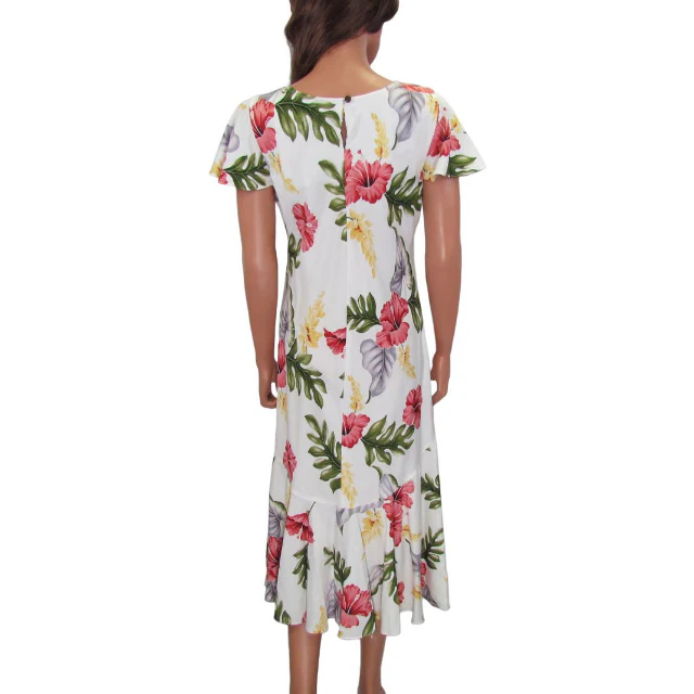 White Hibiscus Flare Sleeve Orchid Print Rayon Dress